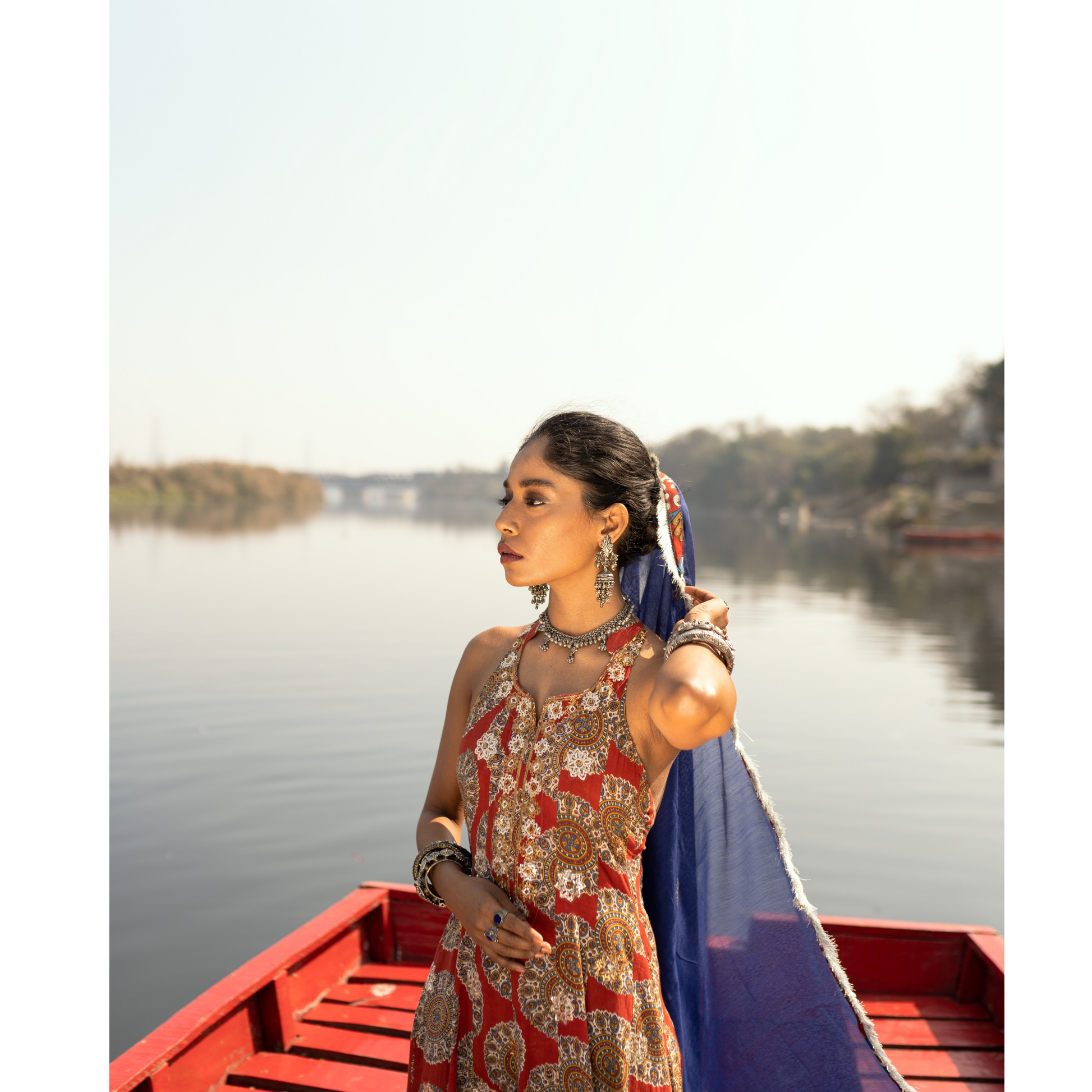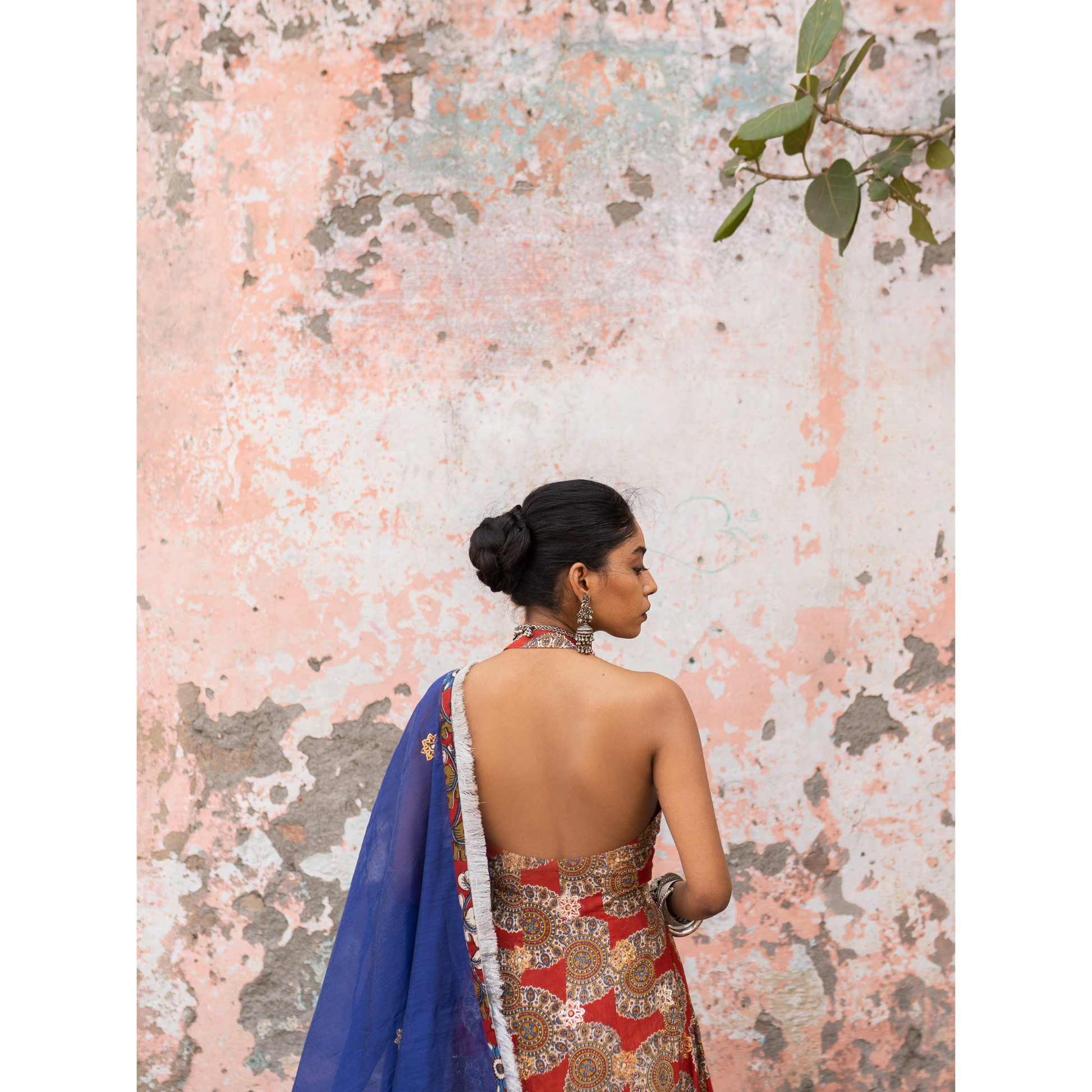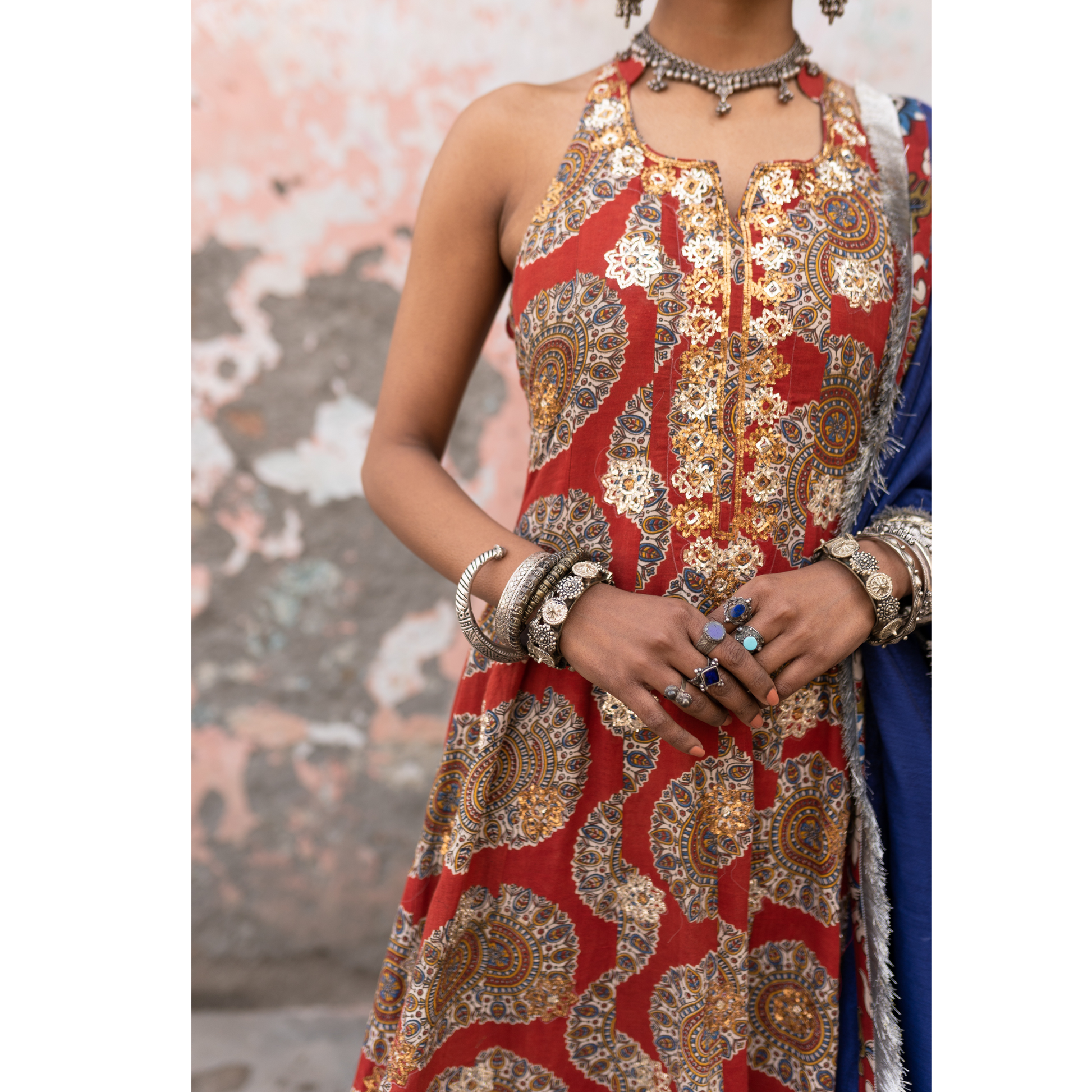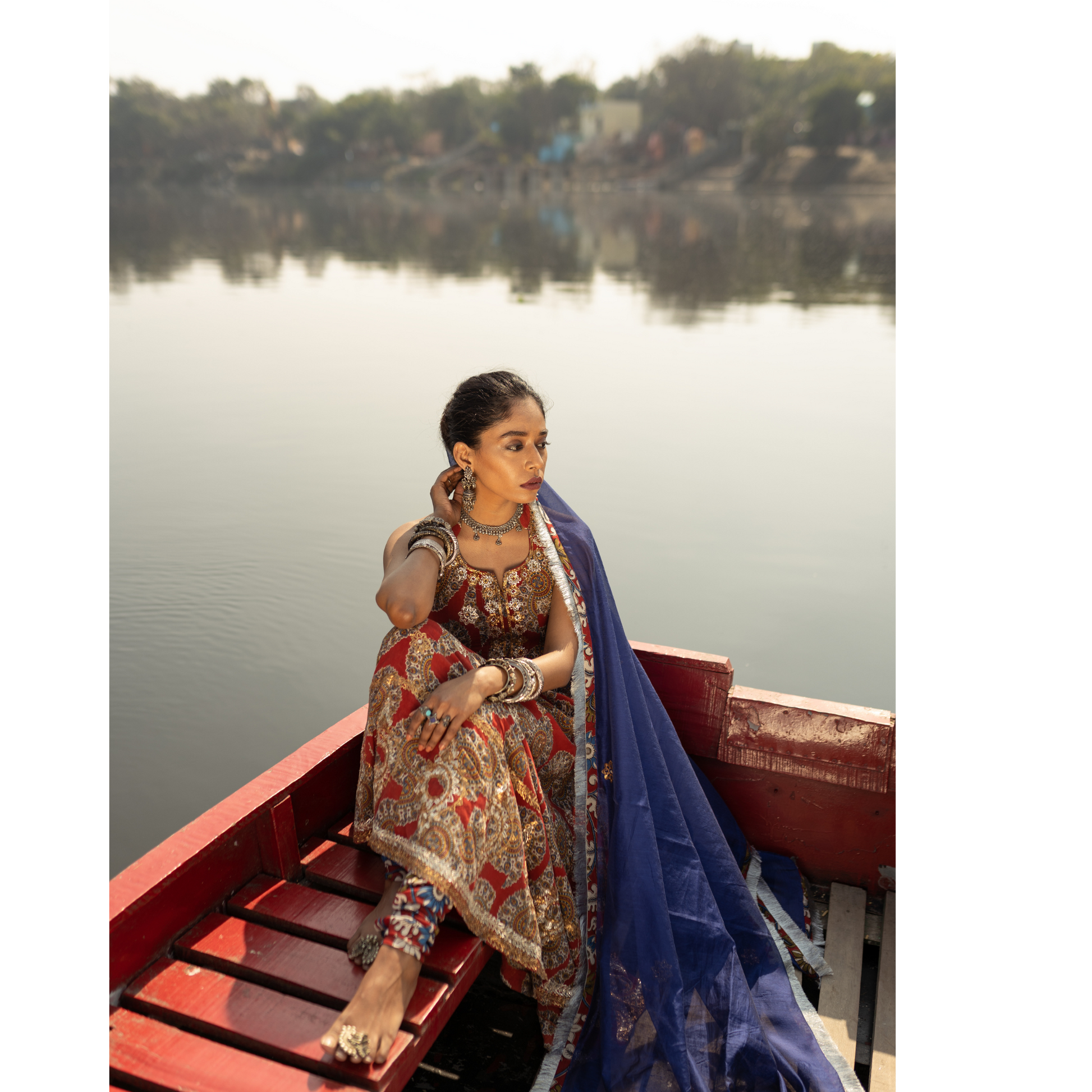 "Step into regal elegance with our Kalamkari hand block maroon cotton anarkali. The garment boasts intricate zardozi pitta embroidery in antique silver, gracing the attire with a touch of opulence. The ensemble is elevated further by a royal blue Chanderi dupatta, adorned with matching zardozi pitta embroidery, creating a stunning interplay of colors and textures. This ensemble effortlessly combines tradition and grandeur, making it a splendid choice for those seeking a blend of classic and contemporary style."